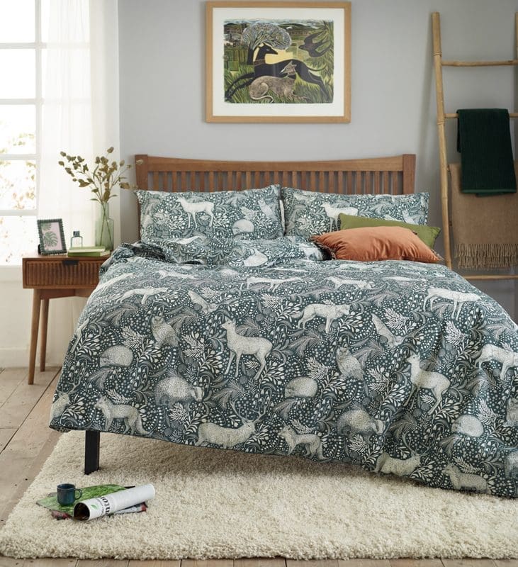 This Woodland Folk Duvet Set from Deyongs brings a cosy blend of charm and comfort to your bedroom, with its enchanting woodland scene printed across a soft cotton-blend fabric. Featuring delicate illustrations of deer and forest foliage on a rich navy backdrop, it adds depth, texture, and a touch of storybook magic to your space.
