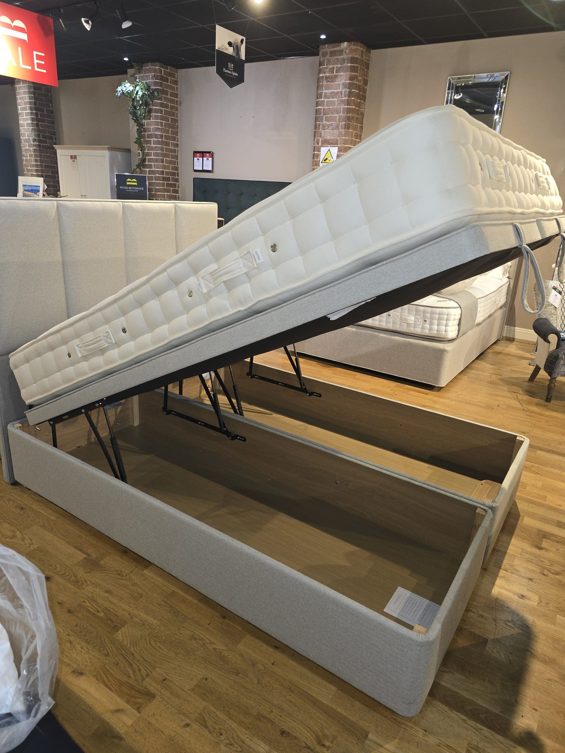 Experience the perfect blend of comfort, craftsmanship, and natural luxury with this Ex Display Hypnos Orthos Support 6 Mattress, paired beautifully with a SuperStorage Ottoman Base and elegant Francesca Headboard.