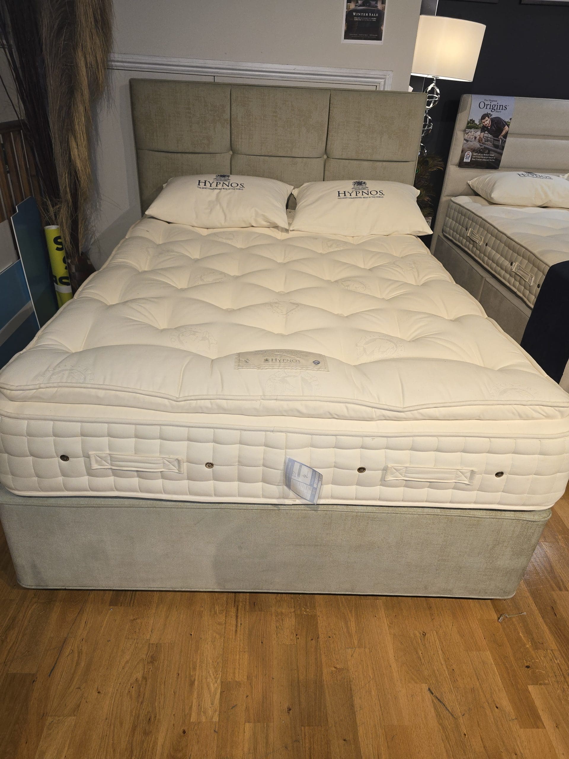 Experience the perfect blend of comfort, craftsmanship, and natural luxury with this Ex Display Hypnos Pillow Top Luxe Mattress, paired beautifully with a supportive Open Coil Firm Edge Divan Base and elegant Fiona Headboard.