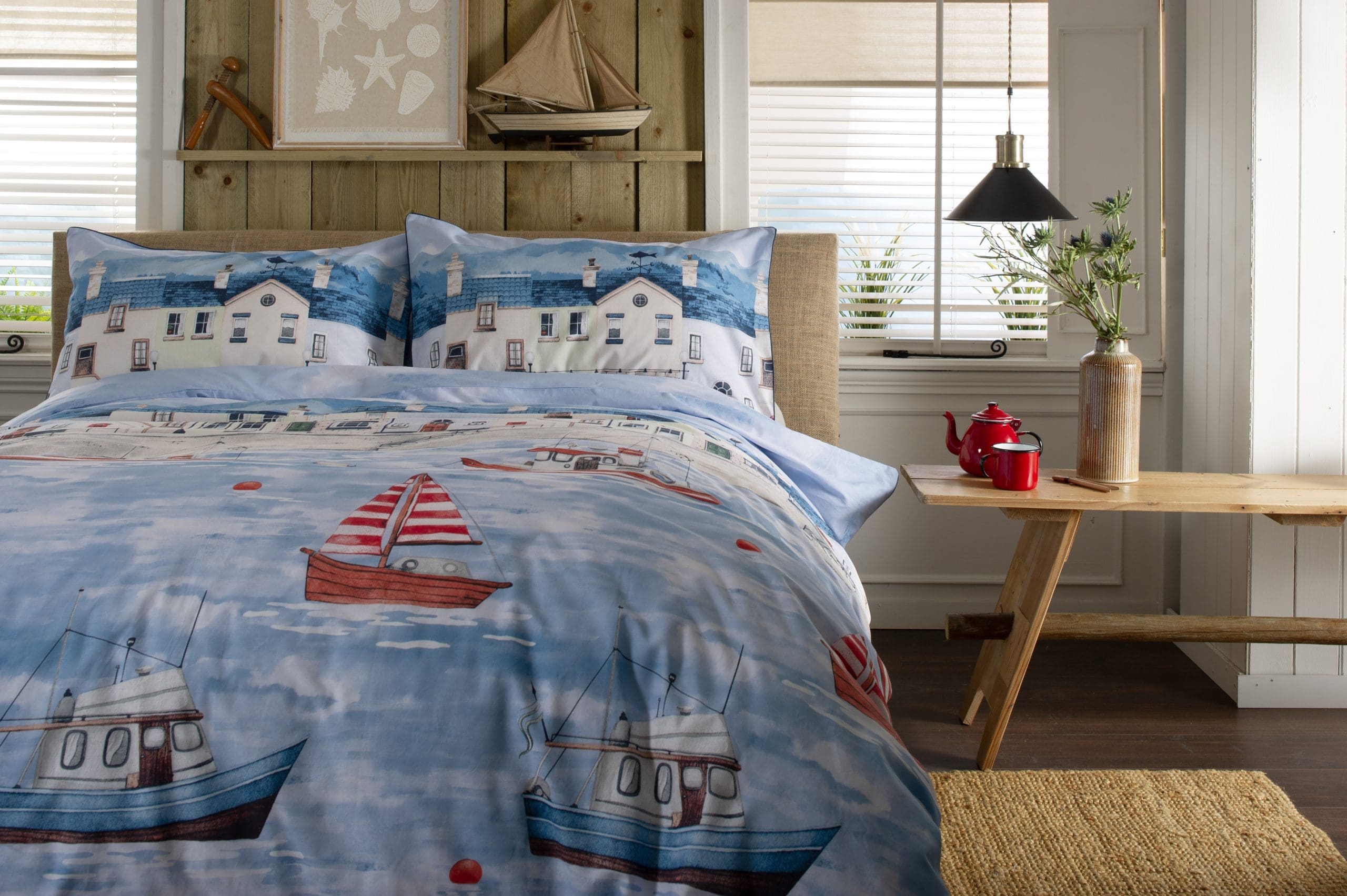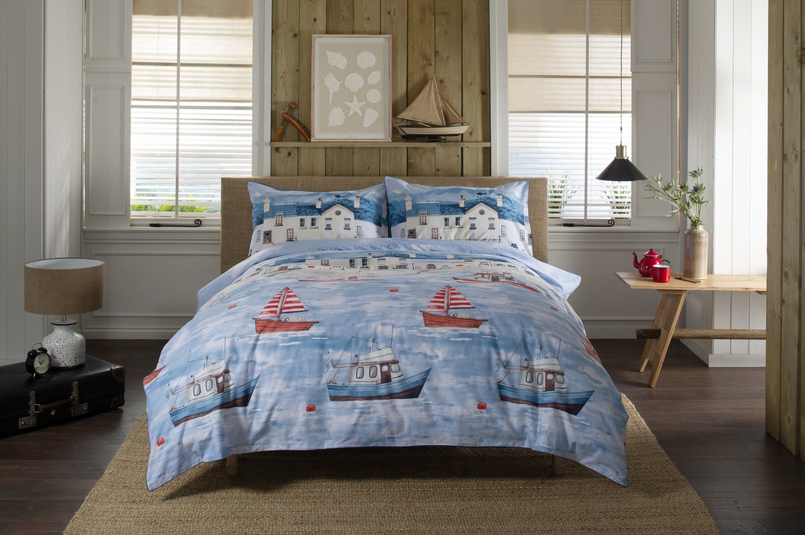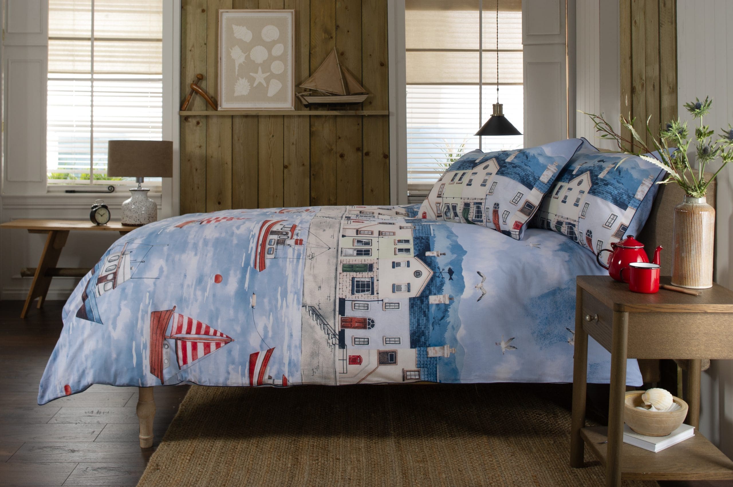 This Coastal Fishing Village Duvet Set from Lobster Creek captures a scenic harbour view with quaint coastal homes, fishing boats, and seagulls soaring across a soft blue sky. It’s a picturesque representation of life in a seaside village, blending charm and tranquillity.