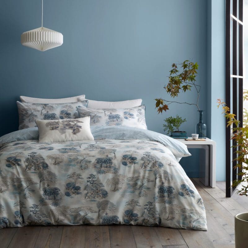 This duvet pattern is inspired by The Garden Of Love, a stunning French toile from 1790 housed in the V&A’s collection of textiles and fashion. Along with traditional love themes of shepards and shepherdesses with their flocks, it depicts amorous doves in a tranquil pastoral setting.