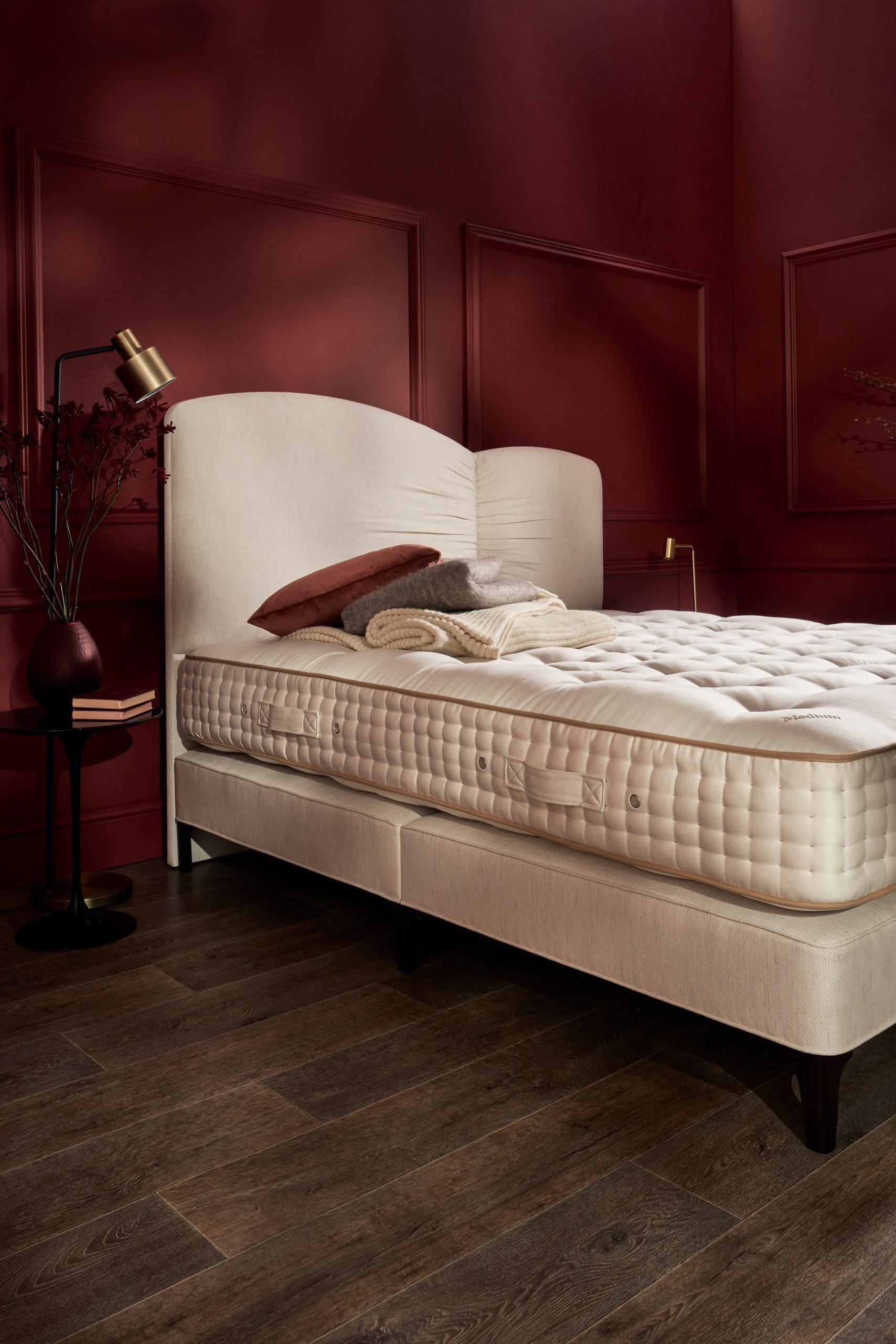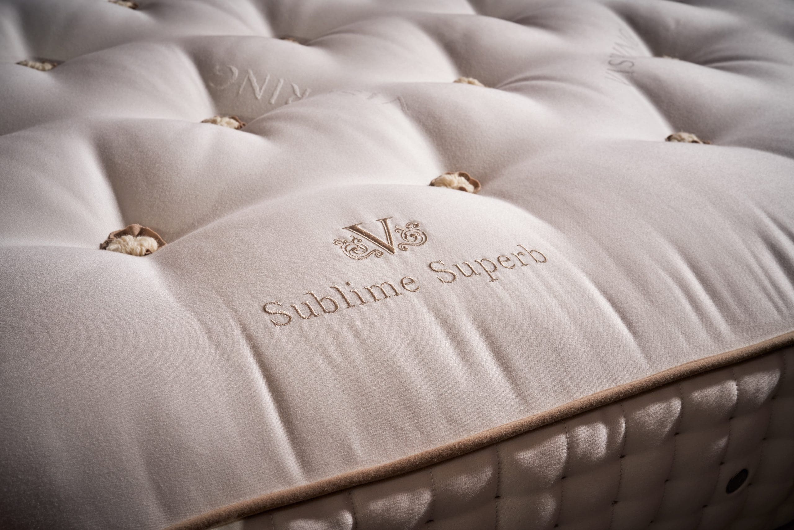 The Vispring Sublime Superb is upholstered with British fleece wool, then 1,525gsm hand-teased long-stranded horsetail blended with real Shetland Isle fleece wool, silk and mohair, enclosed in a hair-proof cambric cover and overlaid with 1,200gsm blended real Shetland Isle fleece wool and cotton.